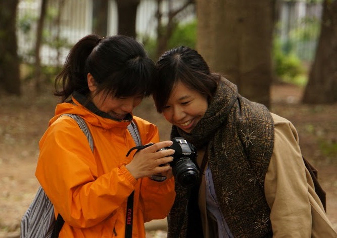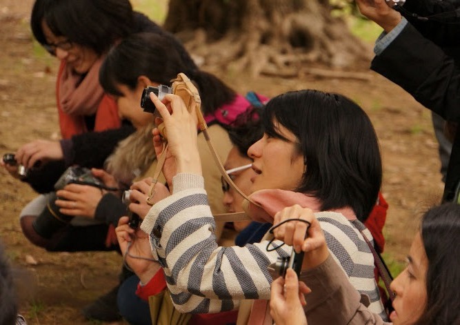はやる気持ちを抑えながらお散歩がてら駒沢公園まで移動します。ここからはお互いをモデルにしながらポートレートを撮る練習をします。まずは参加者の中からおひとりモデルになっていただき、鉄平さんが撮影します。その後は私たちの番。気づけば記者発表のようにカメラ小僧がたくさんいるようでした。実は駒沢公園は鉄平さんの著書のロケ地にもなっている場所で、撮影ポイントがたくさんありました。