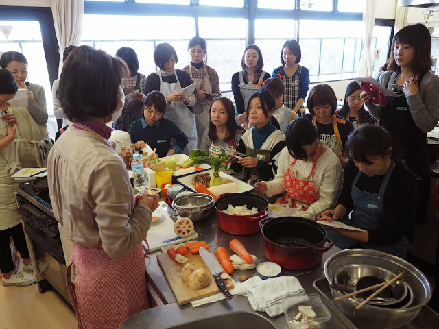 当日の参加者は27名。5テーブルに分かれて、重ね煮作りのスタート! はじめに藤原先生が野菜の見分け方や保存方法など豆知識をちりばめながら 使用する野菜の切り方を見せてくれました。 普段捨ててしまう人参のヘタや蓮根のつなぎ目には栄養が 沢山詰まっているので土を落として、料理に使いました。 野菜に愛情を持って向き合う事、感謝して命を頂くこと。 感謝の気持ちで料理は美味しくなるという藤原先生のお言葉が印象的でした。