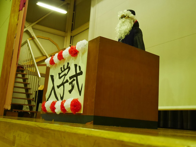 学校へ到着すると、さっそく入学式です。ちょっと緊張しながら入場し、体育館に並べられた椅子に座ります。 校歌を斉唱したり、不思議な校長先生のお話を聞いたり、少し変わった担任の紹介を聞いたりしました。