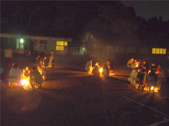たき火を囲み、みんな真剣に語り合います。ゆれる炎を見ながら今朝会ったばかりのクラスメイトと話をする、とっても心休まる時間です。「童心」をテーマに、いろんな意見が行き交い、互いの仲を深められたようでした。