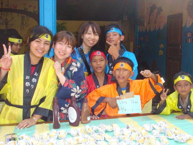 西バライから孤児院へ戻ってきて、午後はいよいよ夏祭り!子どもたちにははっぴを着せて、メンバーは甚平や浴衣に着替えて気合十分。 チョコバナナのチョコレートを顔中にくっ付けながら、ヨーヨー釣りやボウリングをしてみんな楽しそう。 マーケットから呼んできた屋台のおじさんにお願いして作ってもらったニラまんじゅうと餃子の味も最高で、 子どもたちも喜んで食べていました。