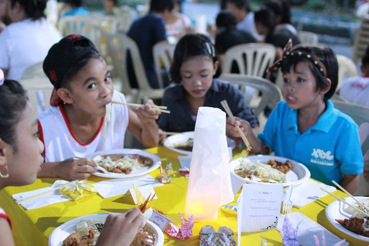 おめかしが完了した子どもたちとスタッフを待っていたのは、+oneメンバーが日本食でおもてなしをする「+oneレストラン」。 テーブルに一人ひとりの席札を用意し、提灯や短冊で会場を彩りました。メンバーは浴衣や甚平を身にまとい、「いらっしゃいませ」と深い一礼で特別なお客様たちを迎えます。 いつもは食事中も忙しく動き回るスタッフの皆さまにもこの日はゆっくり座ってもらい、メンバー全員がウェイターやウェイトレスとして、「あんかけうどん」「唐揚げ」、 そしてデザートには「チョコバナナ」をおもてなししました。「Excuse me waiter!」と嬉しそうにメンバーを呼び止め、水のお代わりを求める子どもたちの嬉しそうな笑顔に、メンバーも思わず笑顔になりました。