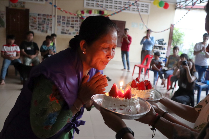 今年は、孤児院のお母さんであるトー・ラエムさんが古希ということもあり、お祝いをしようと計画し、メンバーと子どもたちでケーキ作りや飾りつけをしたりしてサプライズをしました。 ケーキを渡すときに、子どもたちからラエムさんへ一言を伝える場面では、10代半ばの男の子が、「赤ちゃんの時に歩けるように教えてくれたこと、食事を作って食べさせたくれたこと、学校に行かせてくれたこと、すべてに感謝します」と涙を流し、声を震わせながら、感謝の言葉を伝えていました。ラエムさんも涙を流し、みんなで作ったケーキをメンバー一人ひとりに食べさせてくれました。理由を聞いたところ、「みんなも私の子どもだから、食べさせてあげるのは当然なことなのよ」という一言がうれしかったです。