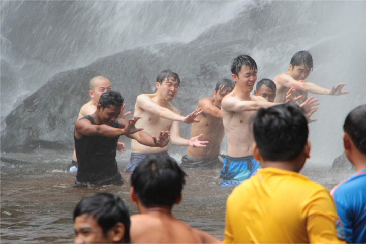 翌日はバスを借りて子どもたちと一緒に、市内から約50kmほど離れたプノンクーレンへ。プノンクーレンは、滝や遺跡があるアンコール発祥の地と言われている神聖な山です。去年、子どもたちに次回みんなで何をしたいか聞いたときに行きたいという意見が多かったので、今回はこの場所へ。バスの中では、名前を覚えるゲームや、伝言ゲームをして盛り上がりました。プノンクーレンに着くと、水遊びが好きな子どもたちは、すぐに水場へ直行!最初は入るのを躊躇していたメンバーも、子どもたちに誘われて、一緒に水を掛け合ったり、滝で修行のポーズをしたりと大はしゃぎで、ずぶ濡れになって遊びました。